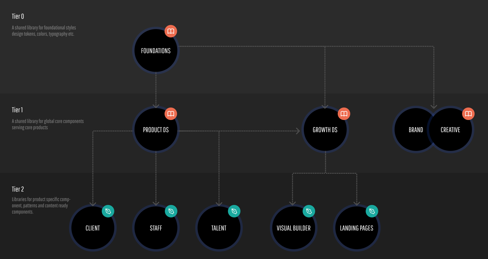 Styles such as color, typography, spacing, shadows, and radii were converted into tokens and managed through Token Studio, ensuring they stayed in sync across both design and code. The figma variables were centralized within a shared library that served not only product teams but also marketing, creative, illustration, and brand—establishing true cross-company consistency and control at scale.